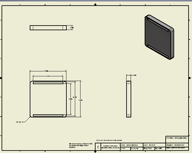 ![]() Orthographic SketchThis image shows the front, top, and right views of the inside shaft of the pencil sharpener. Two bolts found with this part are called out as well. Also included is a cross-section view of the inside shaft. | ![]() Inside Mechanism Orthographic DrawingThe parts were created in Inventor, and orthographic drawings with several views were created. This is the inside shaft piece of the pencil sharpener. | ![]() Bolt Orthographic DrawingTwo of these bolts were used as fasteners for the pencil sharpener; they were modeled in Inventor as well. |